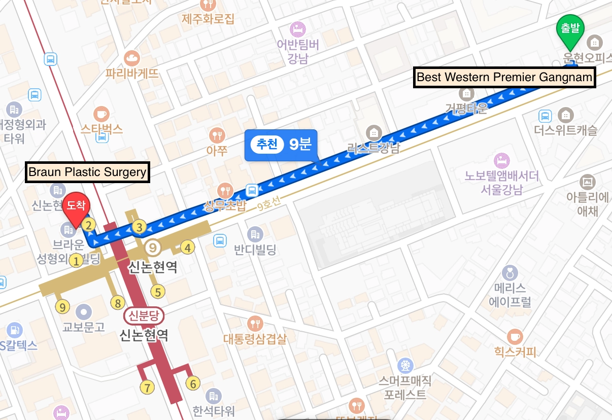 Line 9, Shinnonhyeon Station (7 menit jalan)