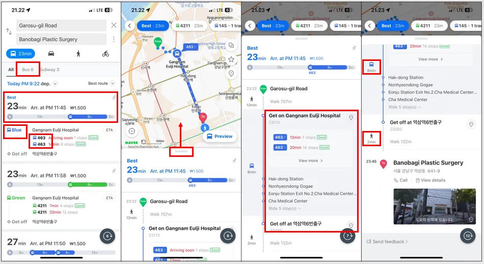 Pilih rute terbaik āBestā karena biasanya rute ini adalah rute yang paling cepat. Angka 463 yang ada pada gambar menunjukan nomor bus yang harus dinaiki āBus berwarna biru dengan nomor 463ā. Kalian harus mencari halte āGangnam Eulji Hospitalā dan Tulisan āRide 5 stopsā menunjukan kalian harus berhenti di pemberhentian ke 5 yaitu ģģ¼ģ6ė²ģ¶źµ¬ atau Yeoksam Exit 6. Sama dengan bus, jika kalian memilih menggunakan subway, maka tampilan yang muncul akan seperti ini :